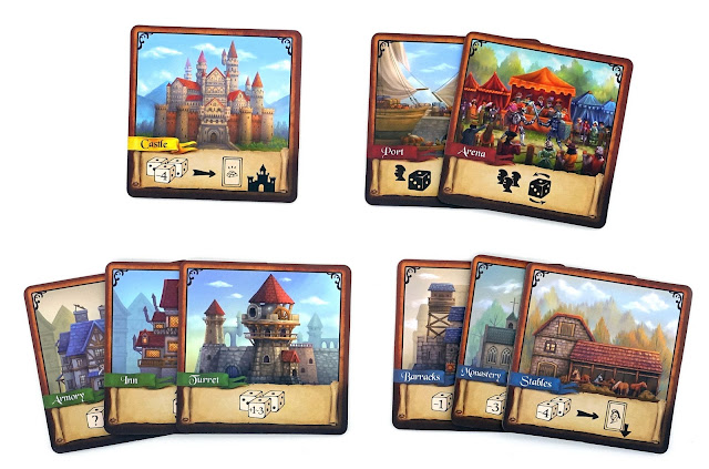 ▲城鎮板塊如果仔細看的話可以分為:金、紅、綠還有藍四種顏色。金色的城堡是每一場遊戲都會用到的板塊;紅色則是每場隨機開出2張;綠色3張;藍色3張。上面這張圖片便是遊戲建議新手玩家們前幾場使用的組合,當你更熟悉這款遊戲之後,板塊是可以根據顏色隨機抽取的。